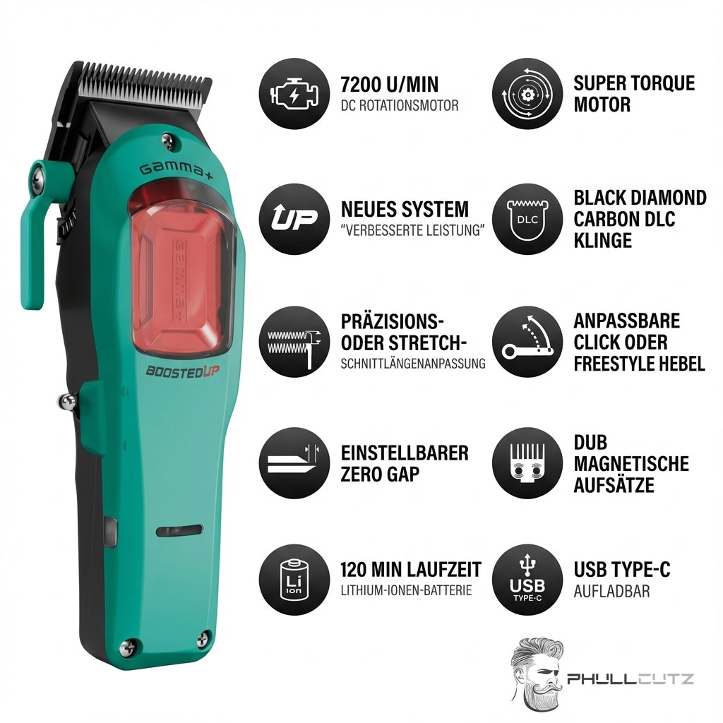 Der Gamma+ Boosted Up Clipper ist eine Innovation in der Welt der Haarschneidemaschinen, die professionelle Barbiere und Stylisten mit ihren vielfältigen Anpassungsmöglichkeiten und leistungsstarken Features überzeugt. Mit einer beeindruckenden Drehzahl von 7.200 U/min und einer Vielzahl an anpassbaren Komponenten, bietet dieser Clipper alles, was für präzise Schnitte und kreative Frisuren benötigt wird.