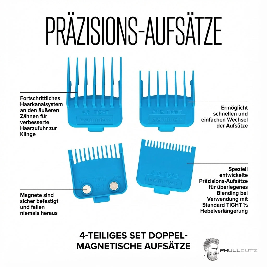 Die Aufsätze sind mit einem fortschrittlichen Kanalsystem an den äußeren Zähnen ausgestattet, das das Gleiten der Klinge über das Haar verbessert. Dies reduziert den Widerstand und sorgt für ein gleichmäßigeres und effizienteres Schneiden. Die Größen von 1,5 mm bis 6 mm decken eine Vielzahl von Schnittlängen ab, was dir maximale Flexibilität beim Styling bietet.