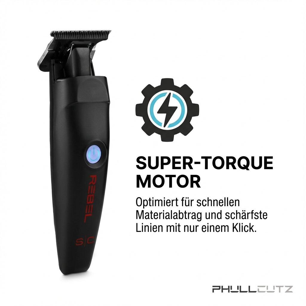 Der Rebel Trimmer kommt mit einer beeindruckenden Ausstattung, die dich in jedem Arbeitsumfeld unterstützt. Der Super-Torque-Motor mit 7.500 Hüben pro Minute ermöglicht eine optimale Massenentfernung und erzeugt die schärfsten Linien in nur einem Zug. Du wirst die Leistung dieses Trimmers bei jedem Schnitt spüren.